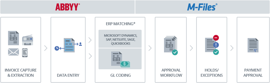 Nền tảng Quản lý Thông tin Thông minh hợp lý hóa các quy trình kinh doanh như các khoản phải trả bằng cách cung cấp các giải pháp tự động hóa đầu cuối. FlexiCapture tận dụng các công nghệ AI để biến nội dung không có cấu trúc thành thông tin có cấu trúc, có thể hành động cho phép M-Files tự động hóa hơn nữa các quy trình và quản lý thông tin thông minh hơn để tạo điều kiện cho chuyển đổi kỹ thuật số.